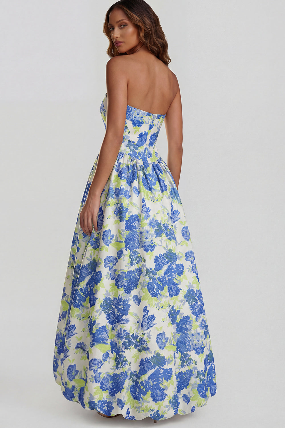 Be the first to review “Strapless A Line Blue White Floral Wedding Guest Dress with Slit”